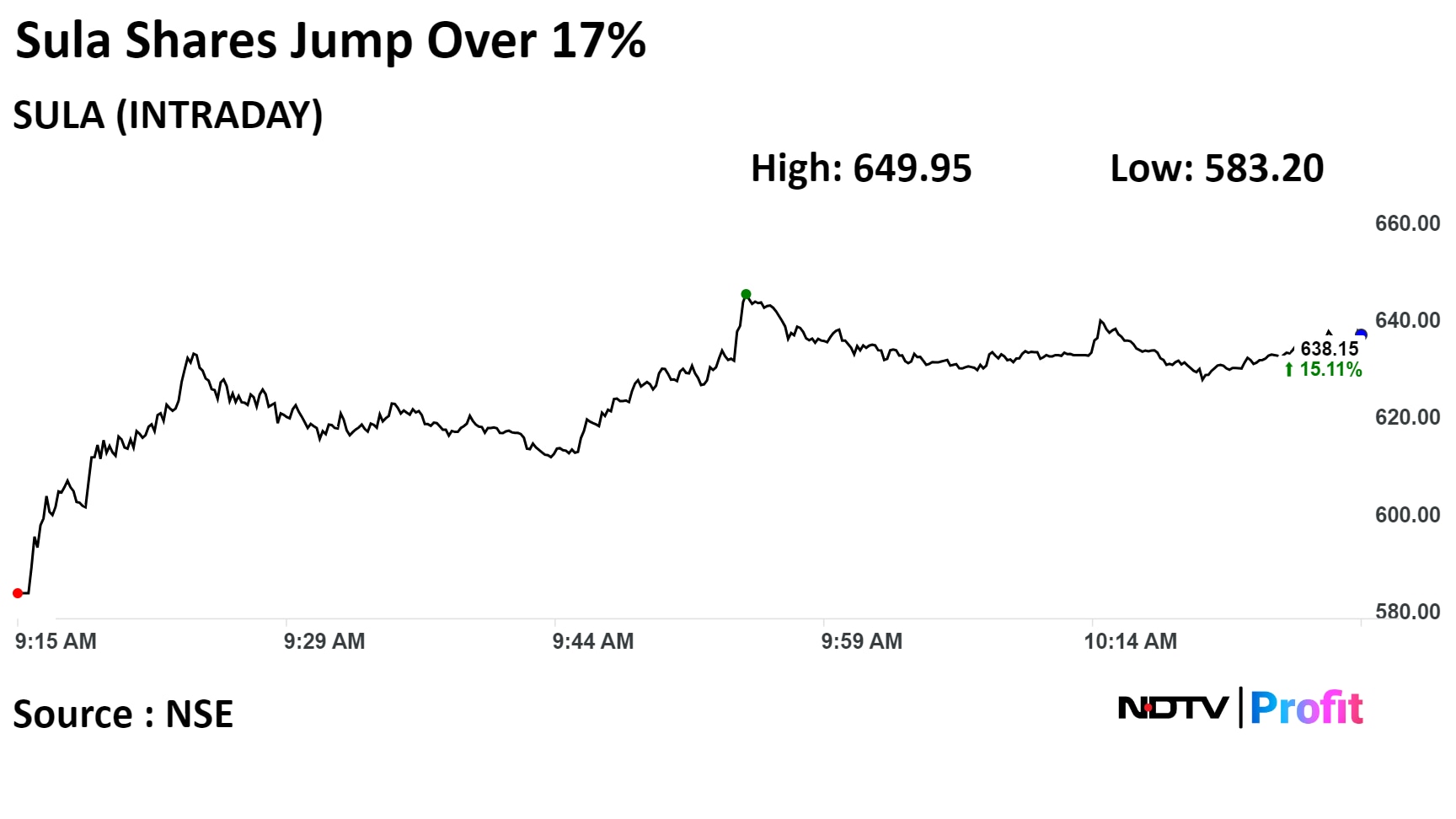 Shares of Sula Vineyards Ltd., jumped as much as 17.23% to hit Rs 649.95, its highest level since listing. It has risen 95.6% in the last twelve months. Total traded volume so far in the day stood at 37 times its 30-day average. The relative strength index was at 88.37, indicating that the stock may be overbought.