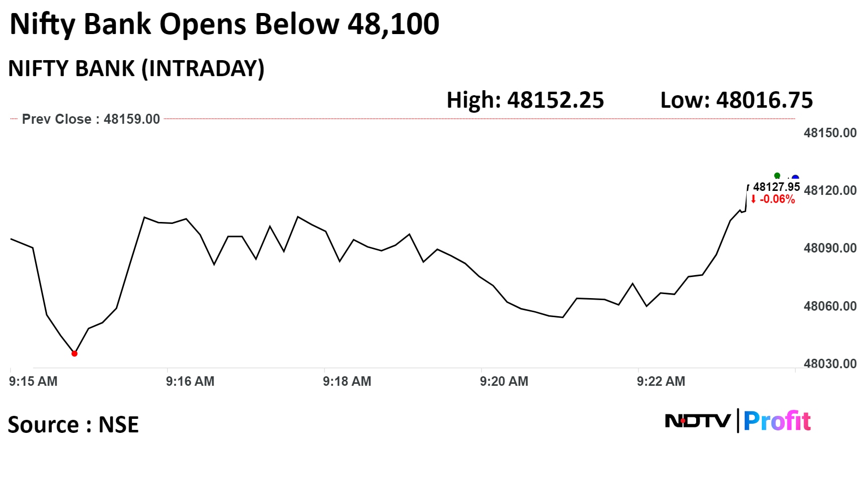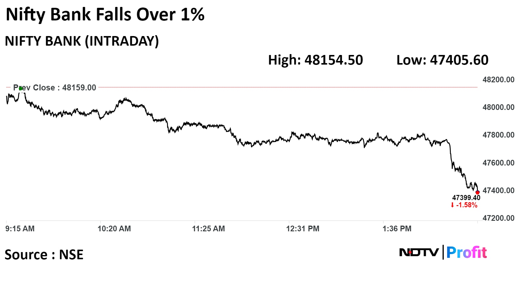 Most bank stocks declined on the NSE, with the HDFC Bank Ltd., State Bank of India and Bank of Baroda declining the most. Only AU Small Finance Bank was up 0.05% on the NSE.