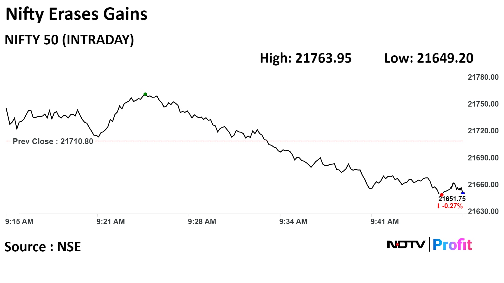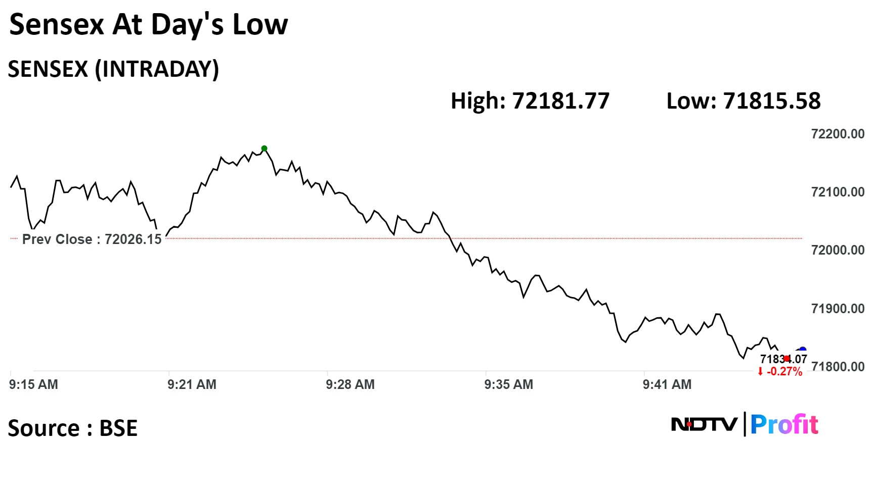 As of 12:30 p.m., the NSE Nifty 50 fell 123 points or 0.57% to 21,587.40, while the S&P BSE Sensex declined 408 points or 0.57% to 71,618.32. The Nifty hit intraday low of 21,552.75 and the Sensex fell to a low of 71,521.16.