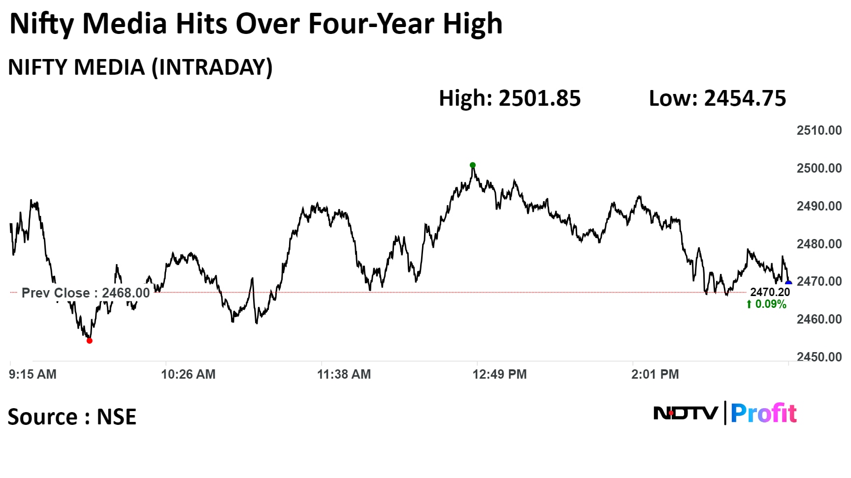 All sectoral indices fell except Nifty Realty and Nifty Media. Nifty PSU Bank fell the most by over 2.5%.