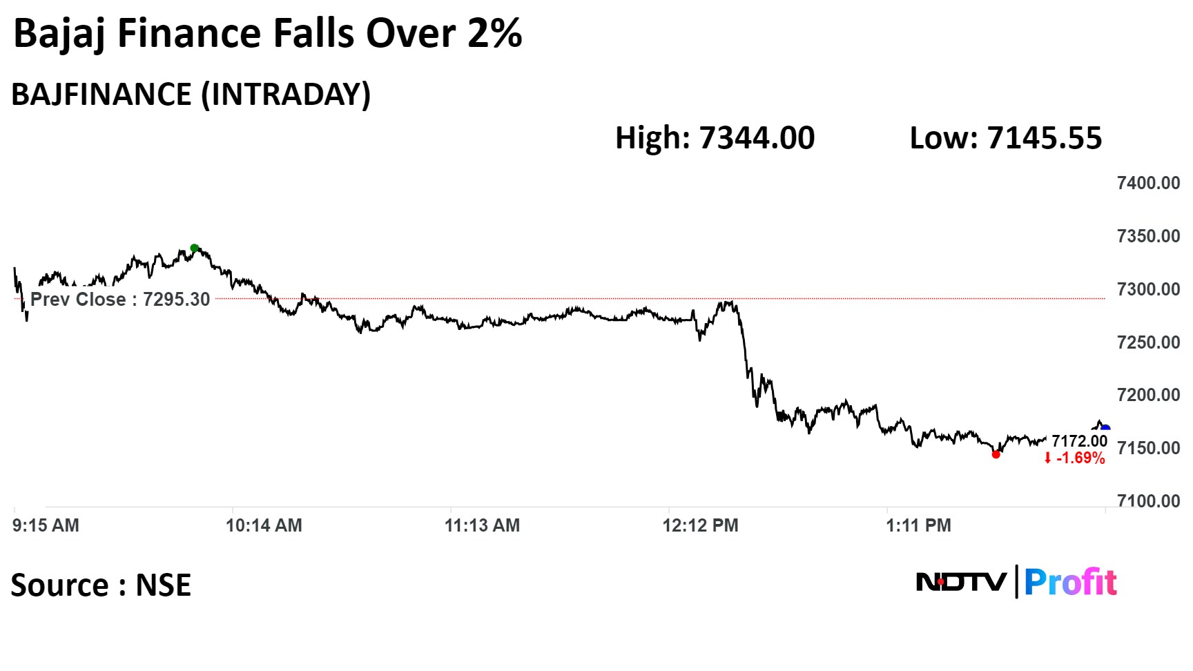 The scrip fell as much as 2.05% to Rs 7,145 apiece. It was trading 1.83% lower at Rs 7,162 apiece, as of 1:56 p.m. This compares to a 0.45% advance in the NSE Nifty 50 Index.