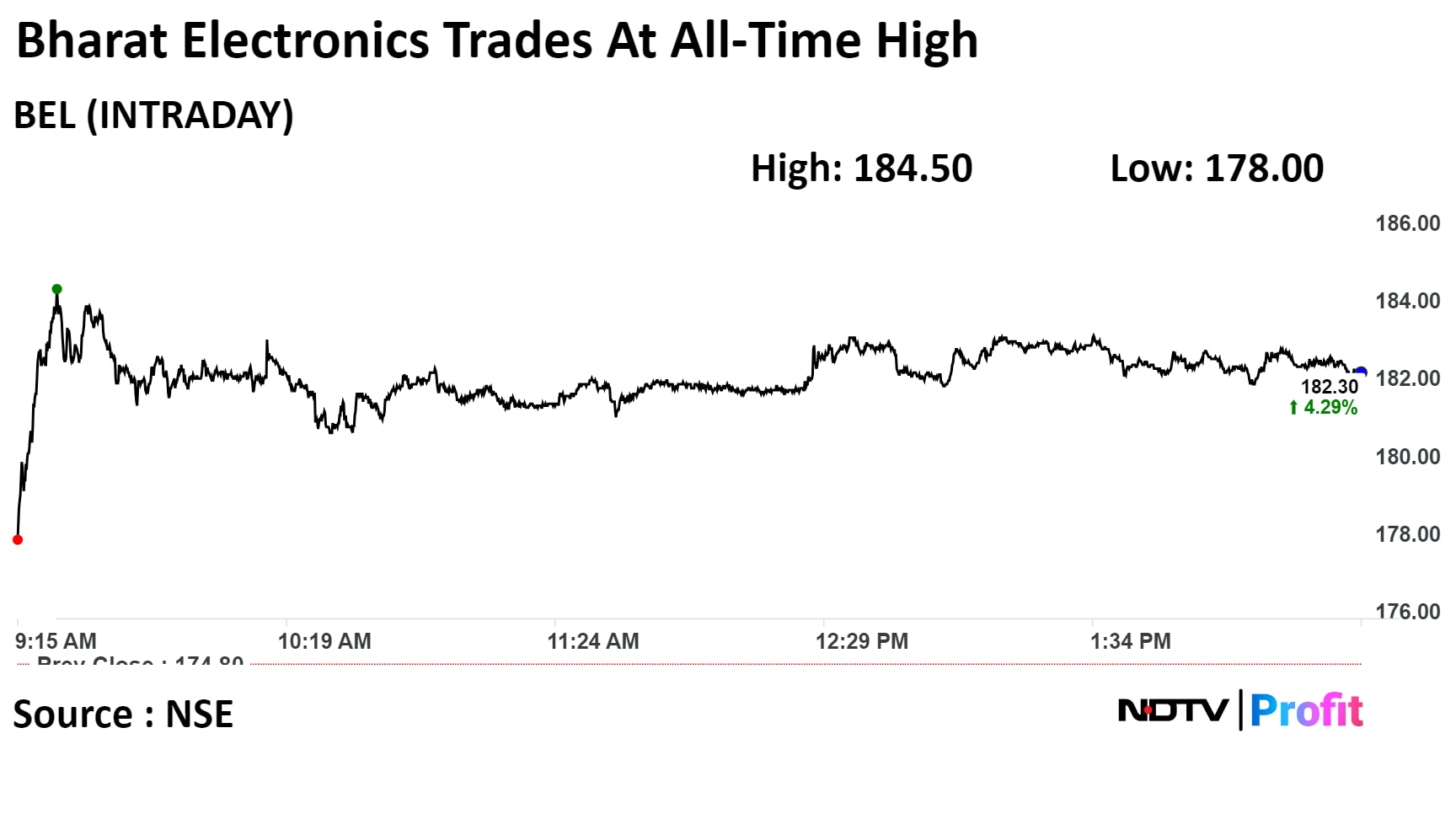 Scrips of Bharat Electronics Ltd rose as much as 5.55% to Rs 185.50 apiece, the highest level since it was listed on Feb 2, 1997. It was trading 4.46% higher at Rs 182.60 apiece, as of 2:26 p.m. This compares to a 0.48% advance in the NSE Nifty 50 Index.
