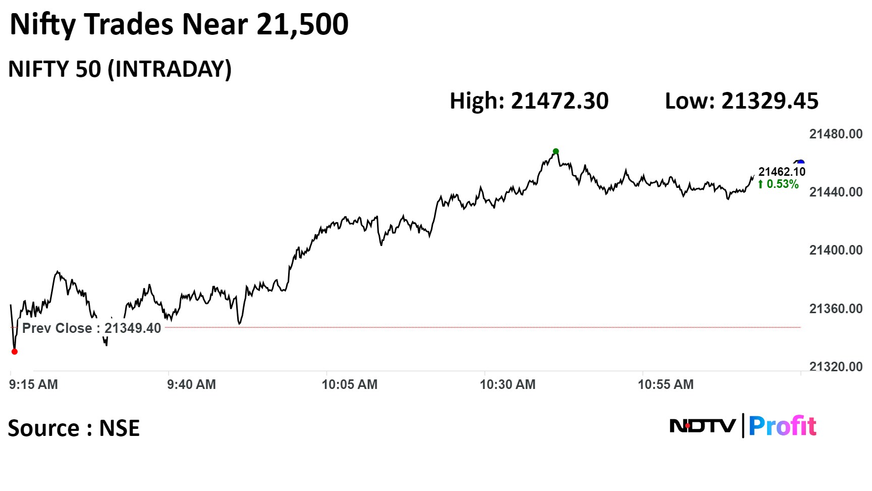 At 11:48 a.m., the NSE Nifty 50 was 106 points or 0.49% higher at 21,455.05 and the S&P BSE Sensex was 275 points or 0.39% up at 71,382.37.