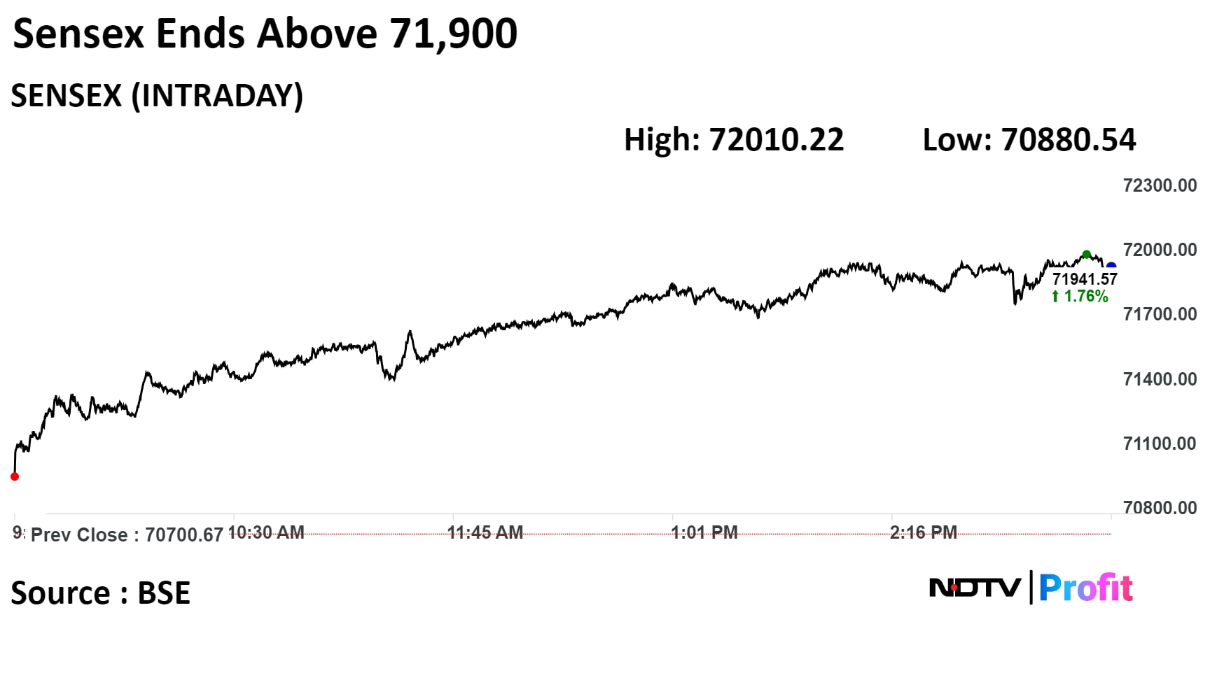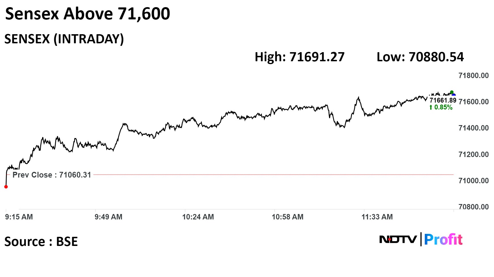 As of 11:59 a.m., the NSE Nifty 50 rose 302.80 points, or 1.42%, to 21,655.40, and the S&P BSE Sensex gained 958.88 points, or 1.36%, to 71,659.55. The Nifty hit an intraday high of 21,664.35, and the Sensex touched a high of 71,691.27.