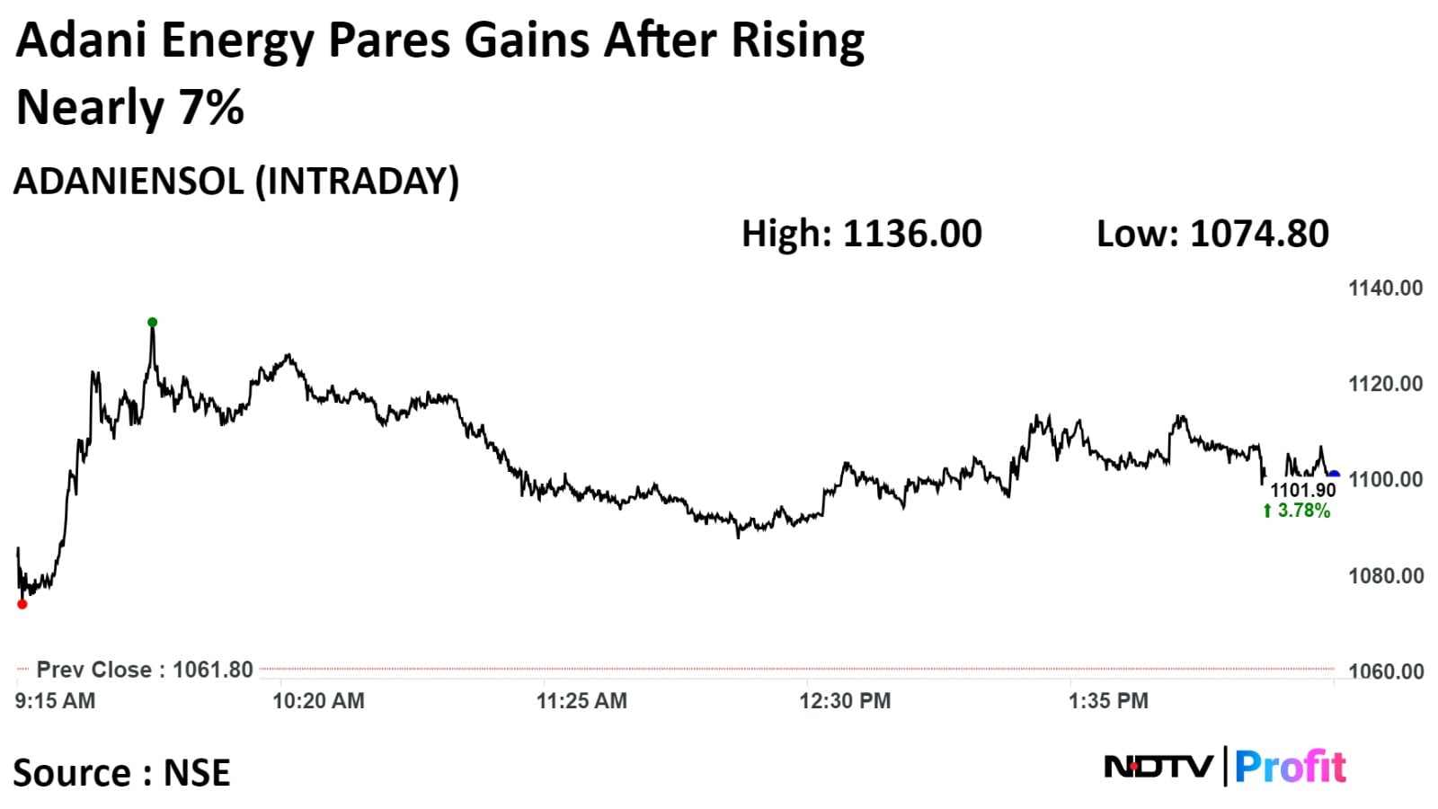 Shares of Adani Energy Solutions Ltd rose 6.99% to Rs 1,136.00. It pared gains to trade 3.69% higher at Rs 1,101.00 as of 2:42 p.m. This compares to 1.32% advance on NSE Nifty 50 index.