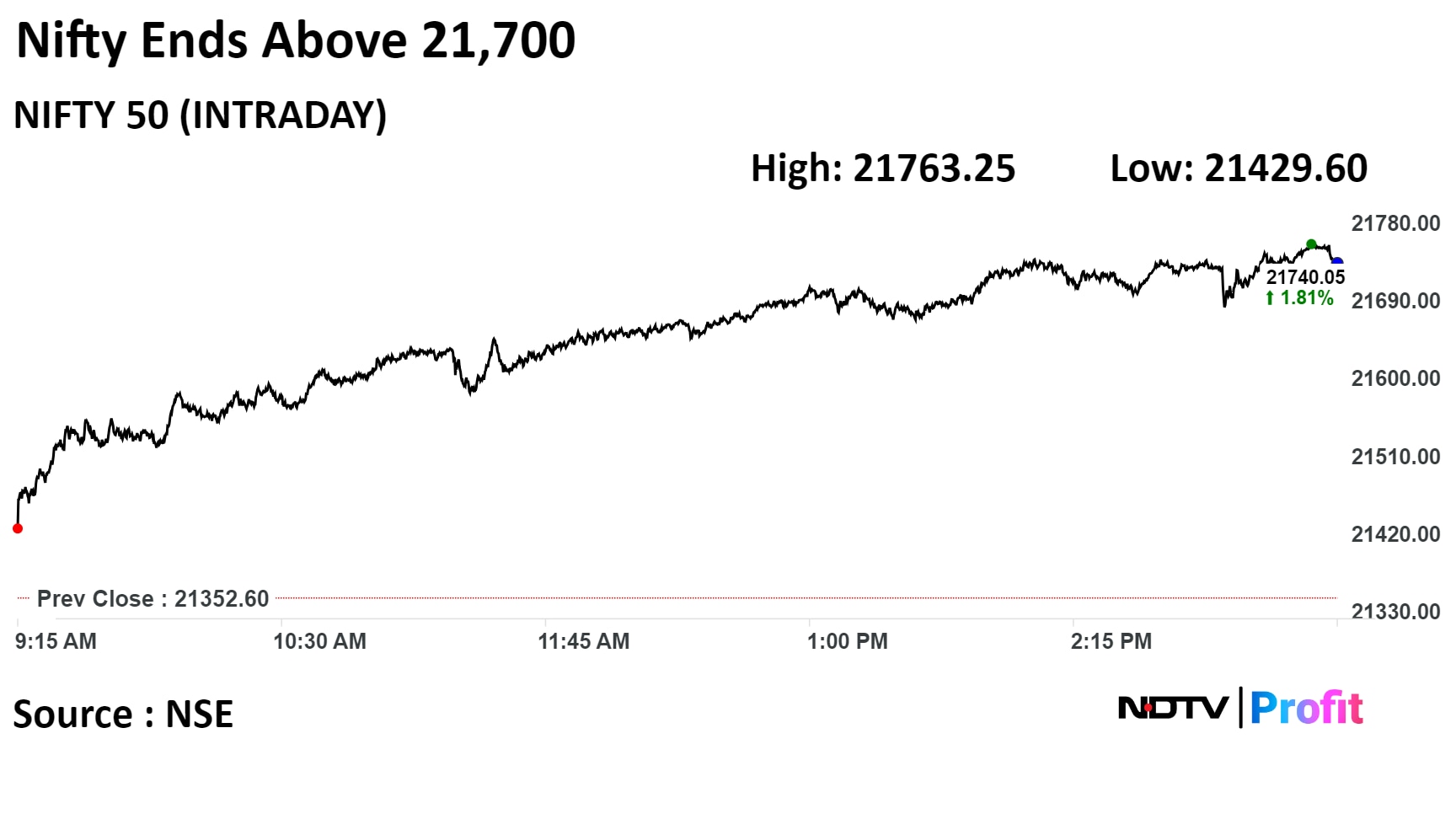 According to Aditya Gaggar, director of Progressive Shares, "In one go only, the Index has breached its multiple hurdles (21,500 & 21,700) and formed a strong bullish candle on the daily chart; however, we assume that Nifty may witness some pressure around 21,750."