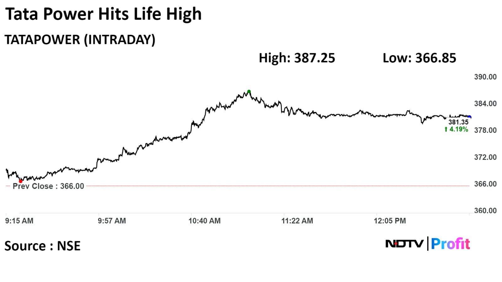 On NSE, Tata Power rose as much as 6.07% to Rs 387.25 apiece, the highest level since its listing on Apr 3, 1996. It pared gains/losses trade 4.35% higher at Rs 381.65 apiece, as of 12:57 p.m. This compares to a 1.14% advance in the NSE Nifty 50 Index.