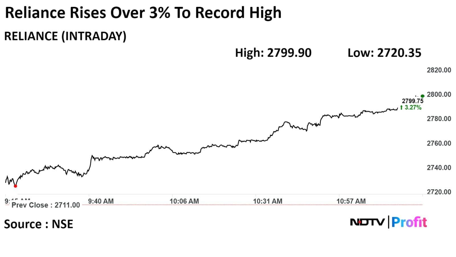 Intraday, shares of Reliance Industries rose over 7% to hit their lifetime high of Rs 2,904.40 as crude prices rose amid escalating tensions in the Middle East.