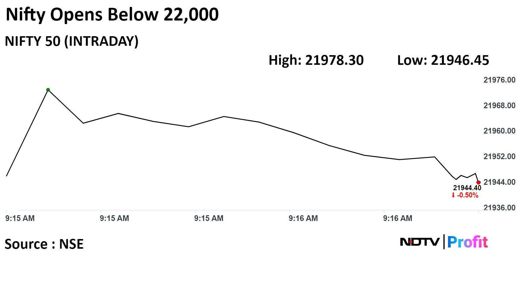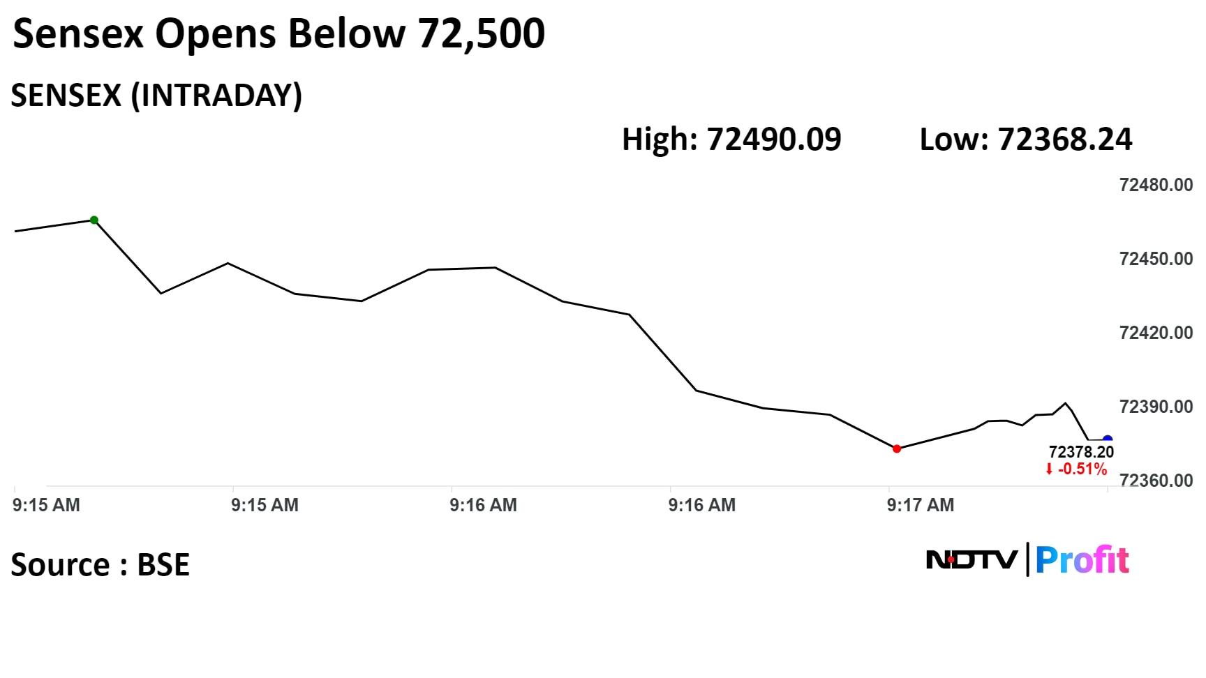 At pre-open, the S&P BSE Sensex Index was at 72,462.94, down 285.48 points or 0.39% while the NSE Nifty 50 was at 21,946.45, down 109.25 points or 0.50%.