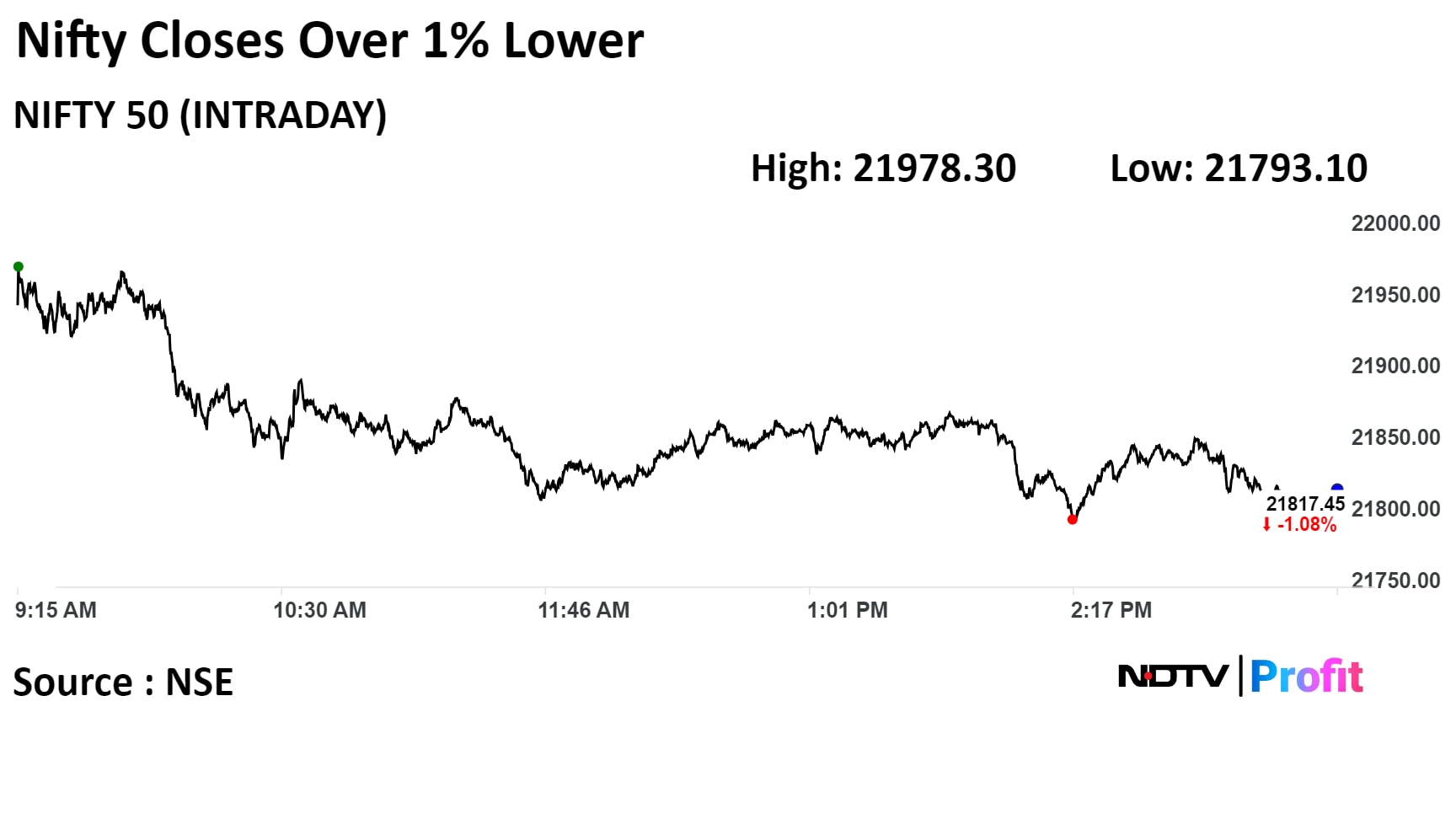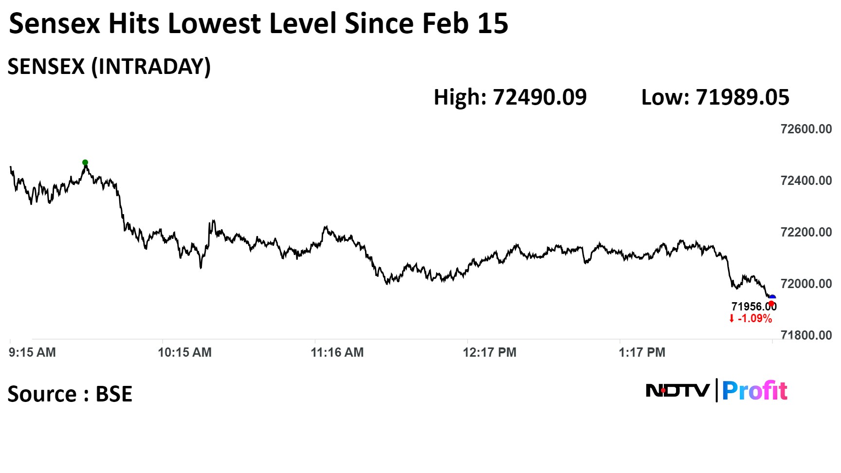 The Nifty closed 238.25 points or 1.08% lower at 21,817.45 points, its lowest level since February 13 while the Sensex closed at its lowest level since February 14 at 72,012.05, lower by 736.38 points or 1.01%.
