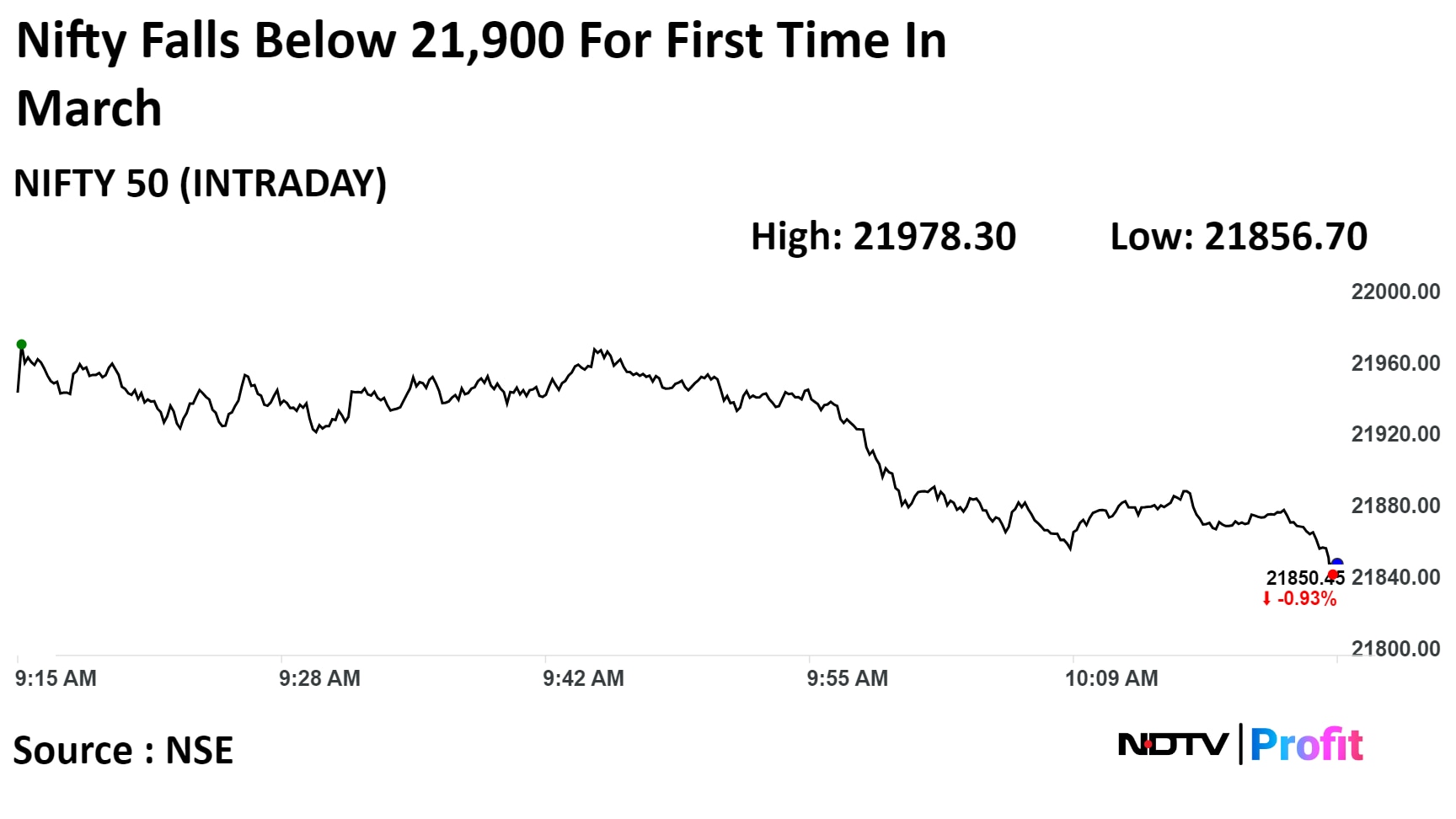 As of 11:53 a.m. the NSE Nifty 50 was trading 219.15 points or 0.99% lower at 21,836.55, and the S&P BSE Sensex was trading 669.77 points or 0.92% down at 72,078.65.