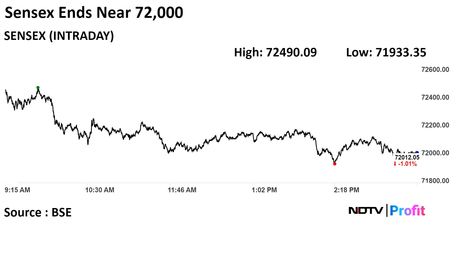 Intraday, the Nifty slumped as much as 1.12% to 21,808.45, and the Sensex declined 1.02% to 72,007.35.