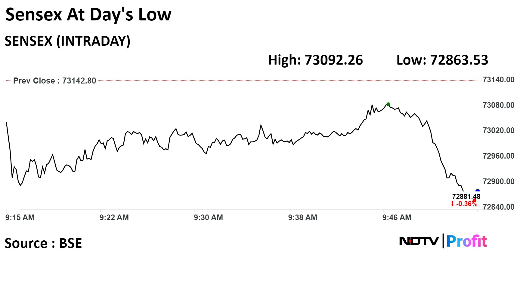 At pre-open, the NSE Nifty 50 was 43.50 points or 0.2% lower at 22,169.20, and the S&P BSE Sensex was 0.18% or 97.99 points lower at 73,044.81.