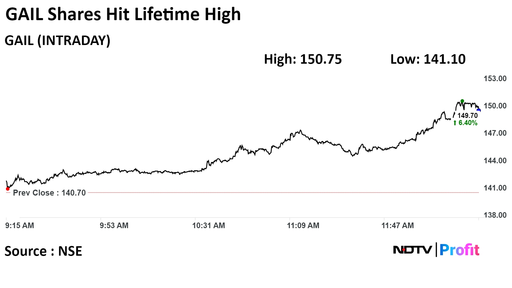 The scrip rose as much as 7.14% to Rs 150.75 apiece, its highest level. This compares to a 0.40% advance in the NSE Nifty 50 Index.