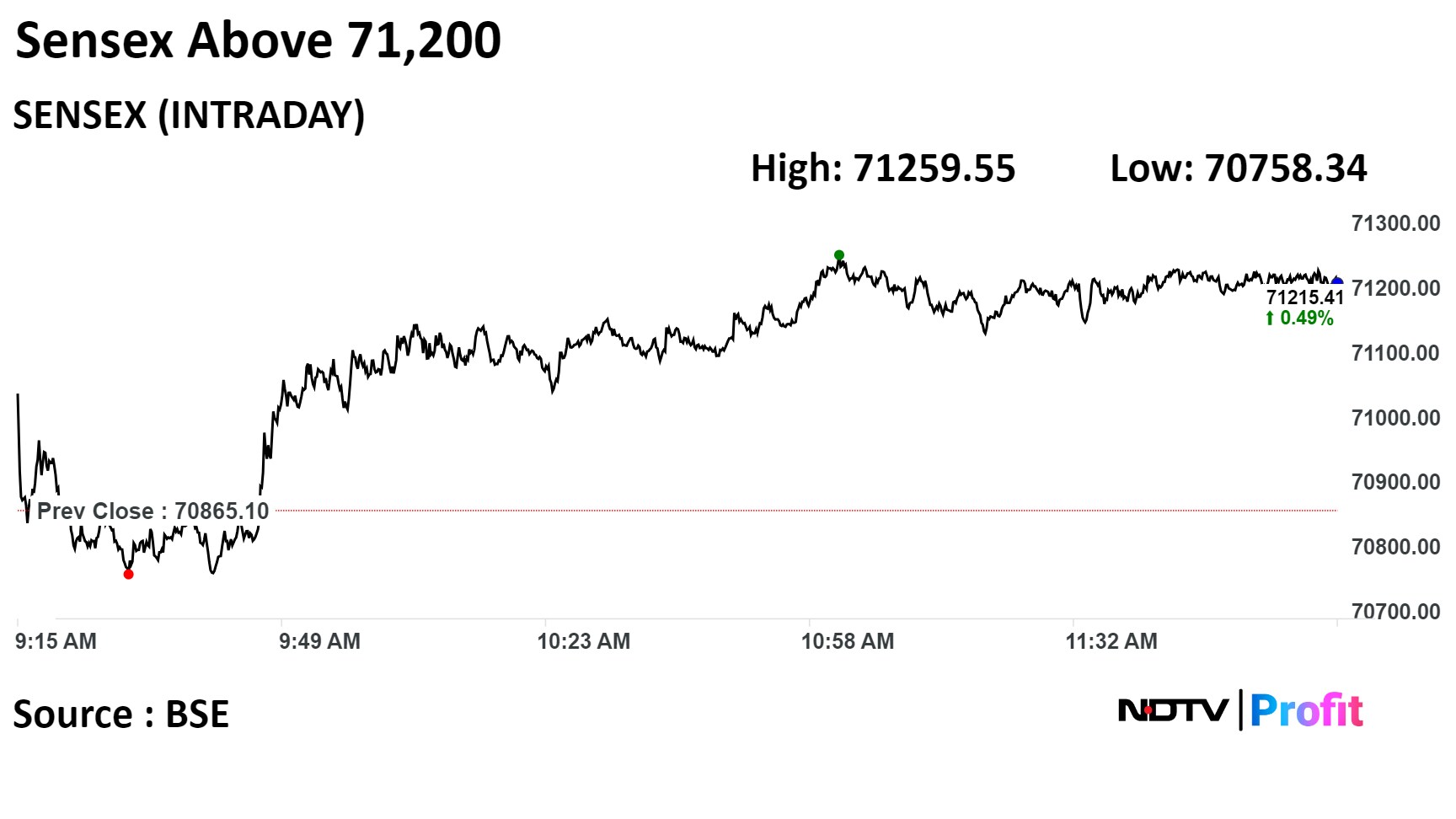 At 12:04 p.m., the NSE Nifty 50 was 127 points or 0.60% higher at 21,381.65, while the S&P BSE Sensex was trading 0.50% higher or 352 points higher at 71,217.06.