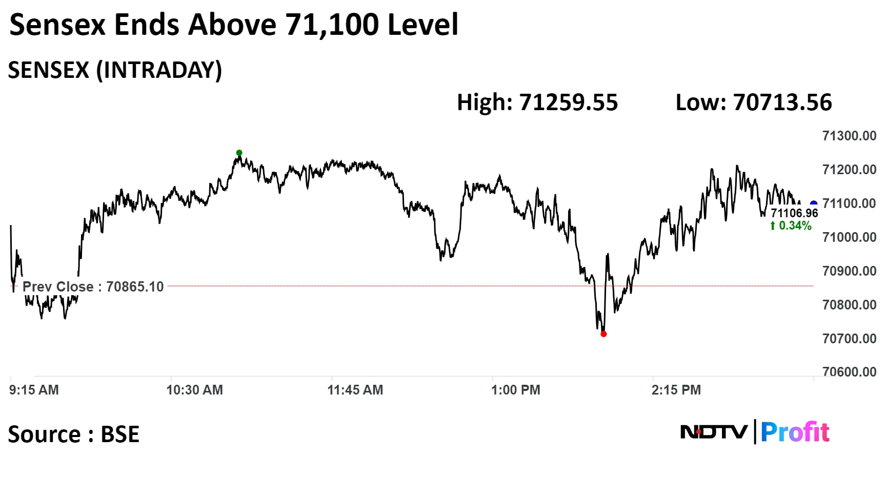 Today, the Nifty ended higher by 94.35 points or 0.44% at 21,349.40 and the Sensex closed 241.86 points or 0.34% higher at 71,106.96. Intraday, the Nifty hit a high of 21,390.50 points and Sensex hit a high of 71,259.55 points.