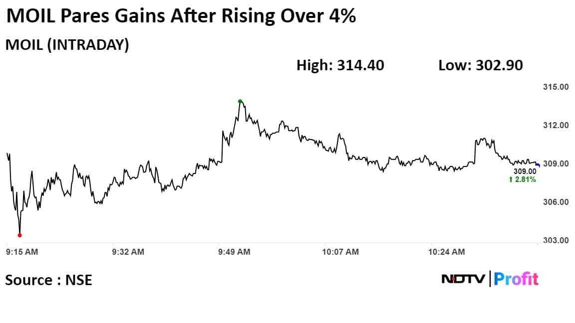 MOIL shares rose as much as 4.61% to 314 apiece. It had last traded around these volumes on Dec 19, 2023. It was trading 3.48% higher at Rs 311 apiece, as of 10:32 a.m. This compares to a 0.072% advance in the NSE Nifty 50 Index.