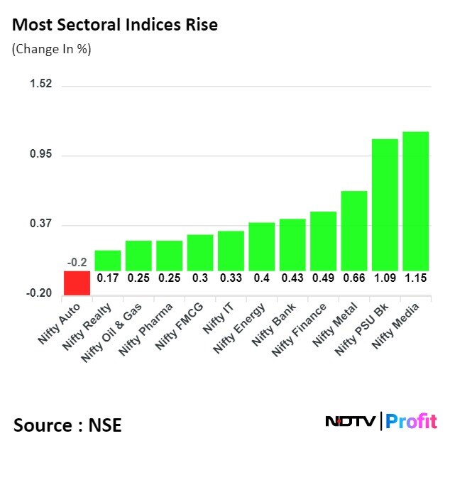 All sectoral indices, except Nifty Auto, gained. Nifty Media and Nifty PSU Bank gained over 1%.