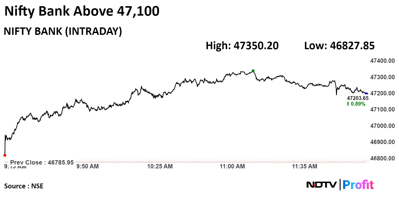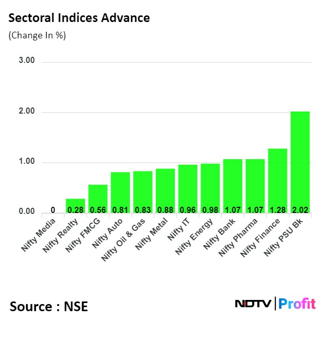 On the NSE, all 12 sectors advanced, with the Nifty PSU Bank rising the most among peers.
