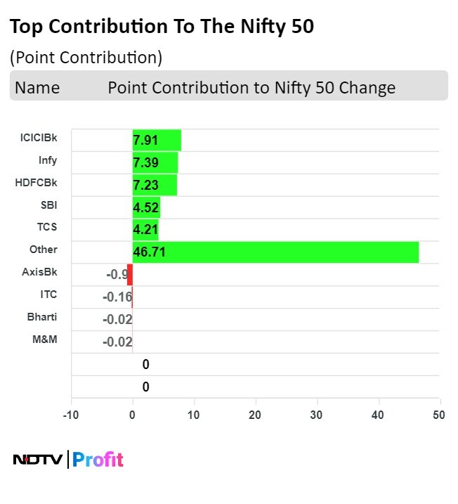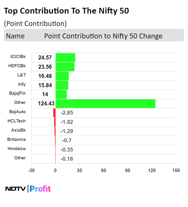 Shares of ICICI Bank Ltd., State Bank Of India, Larsen & Toubro Ltd., Bajaj Finance Ltd., and HDFC Bank Ltd contributed the most to the gains.