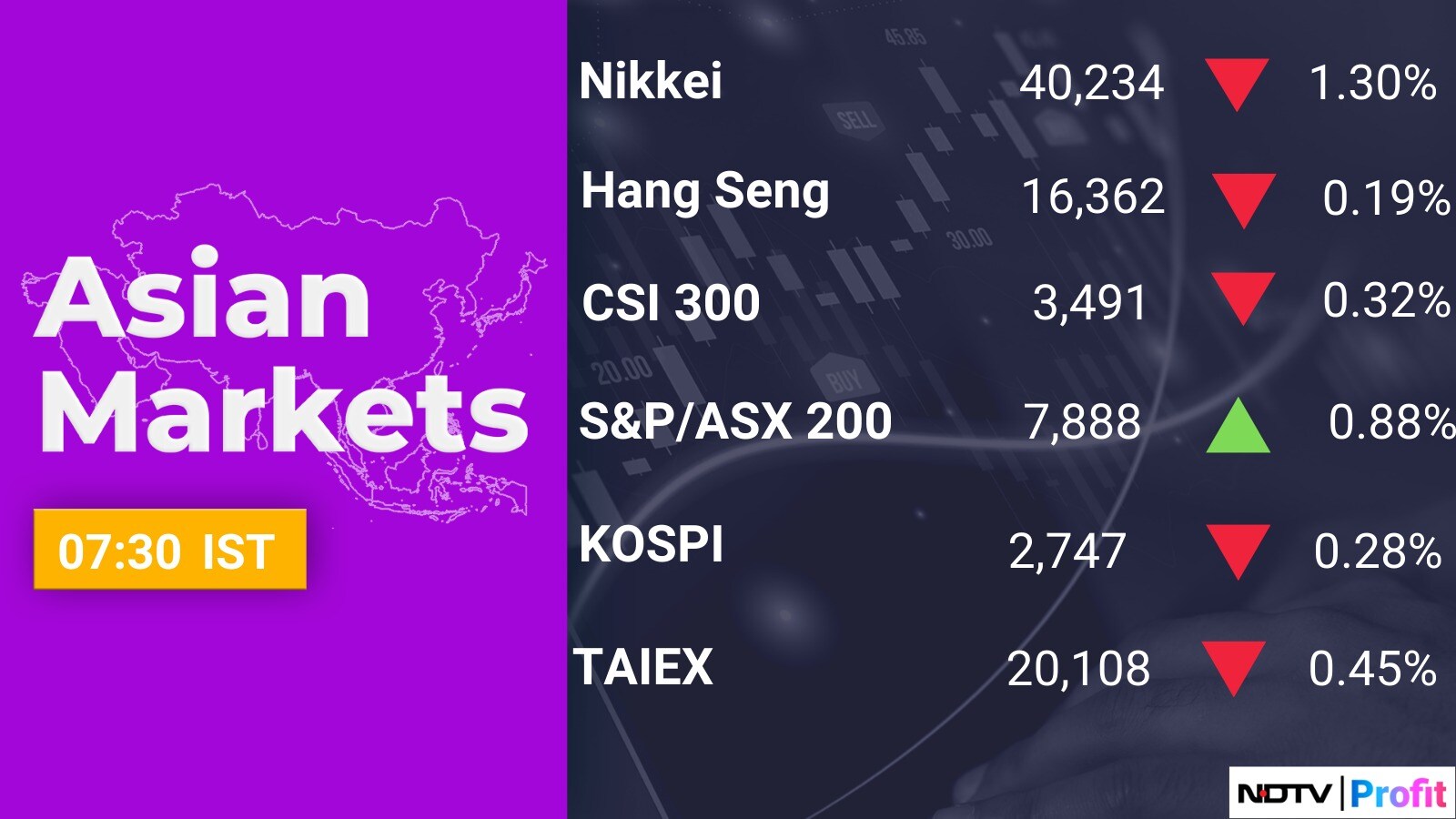 The Nikkei 225 was trading 342.60 points or 0.84% lower at 40,420.13, and the KOSPI index was 4.36 points or 0.16% down at 2,750.75 as of 06:32 a.m.