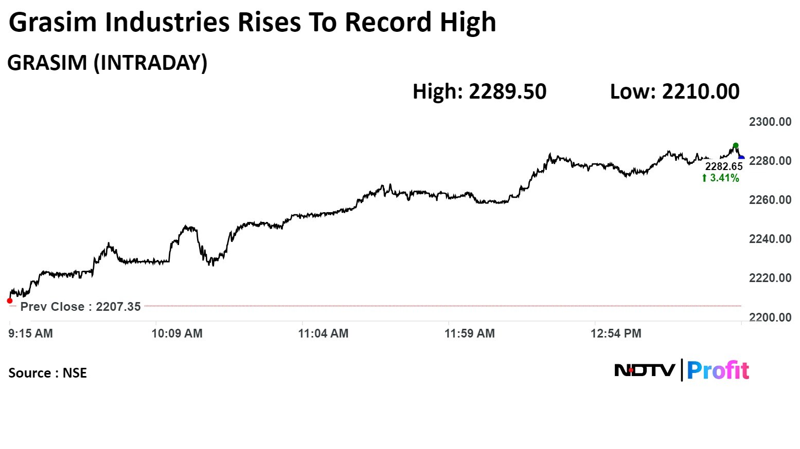 Grasim Industries Ltd. rose as much as 3.72% to Rs 2,289.50 apiece, the highest level since its listing on May 10, 1995. It was trading 3.57% higher at Rs 2,286.25 apiece, as of 1:55 p.m. This compares to a 1.39% advance in the NSE Nifty 50 Index.