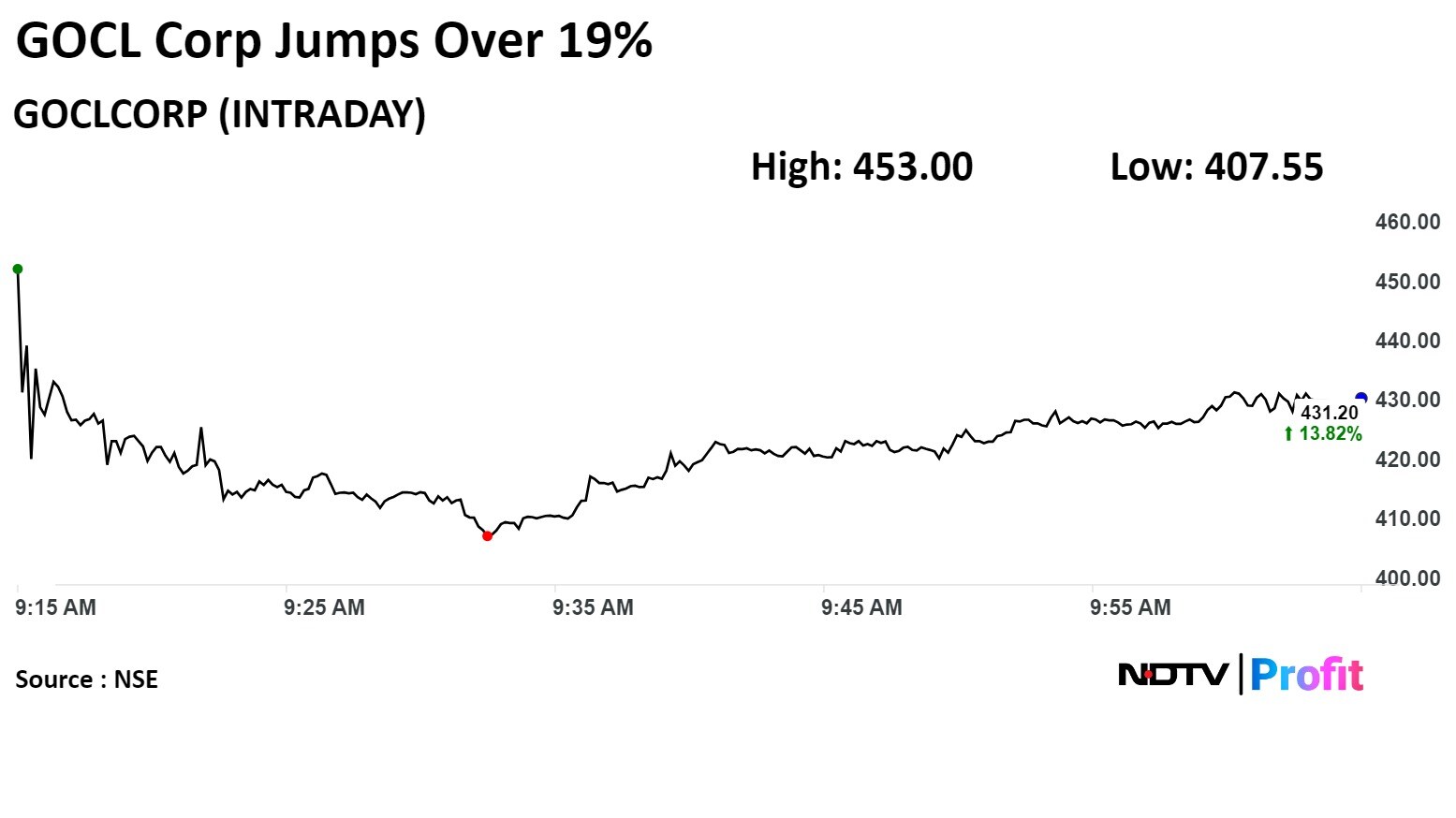 GOCL Corp Ltd. jumped 19.57% to Rs 453.00, the highest level since March 11. It pared gains to trade 12.59% higher at Rs 426.55 as of 10:09 a.m. This compares to 0.83% advance in the Nifty 50 index.