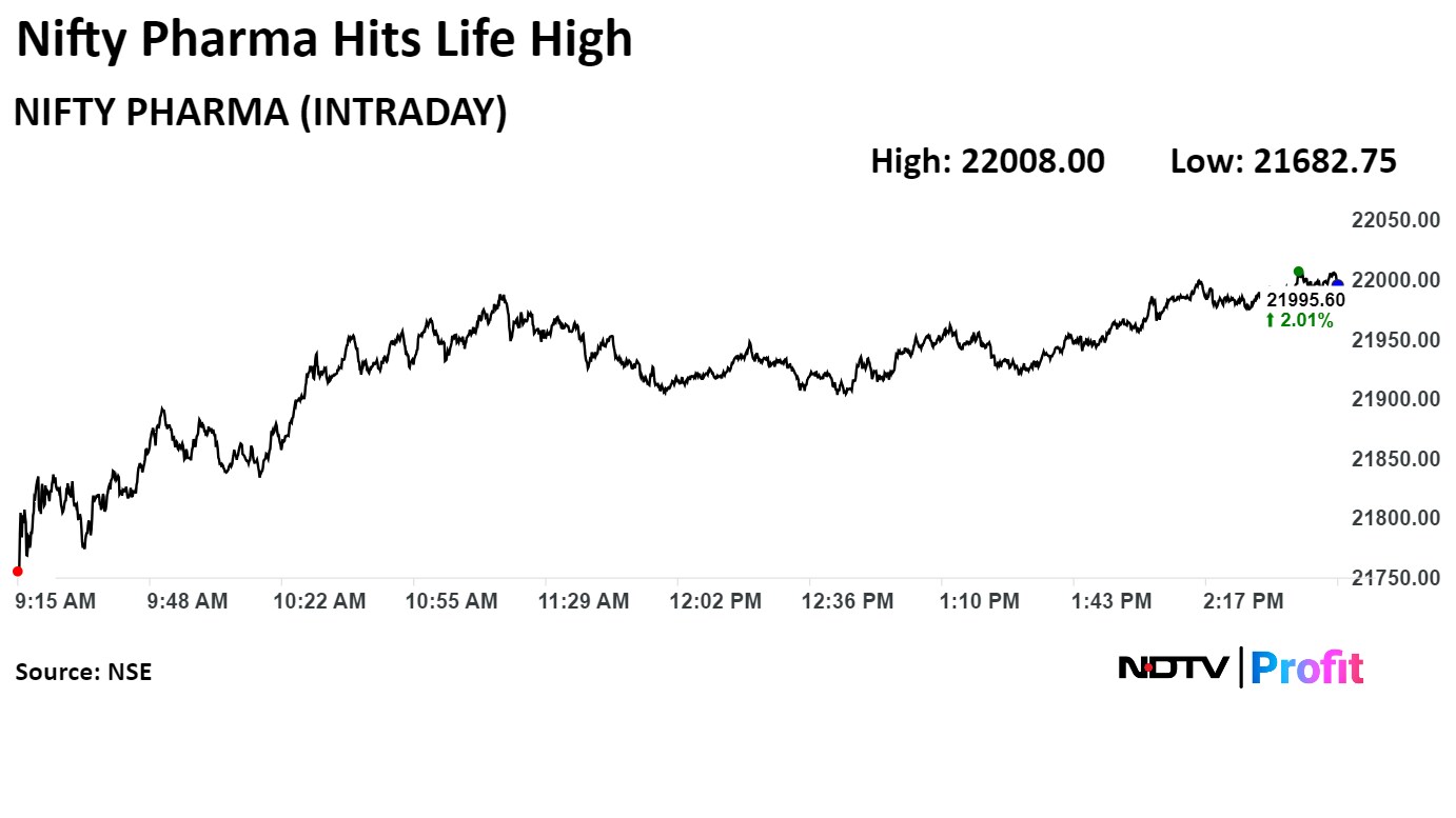• The NSE Nifty Pharma scaled a fresh high of 22,008.00.
