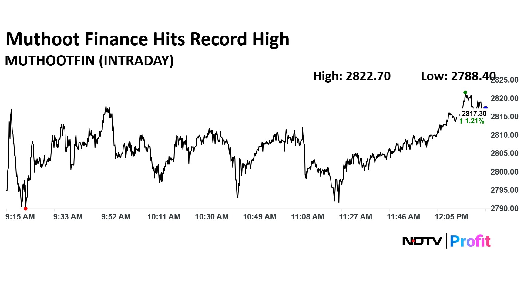 Muthoot Finance Ltd. share price rose 1.40% to a record high of Rs 2,822.70 apiece. The stock was trading 1.24% higher at Rs 2,818.6 apiece as of 12:26 p.m.