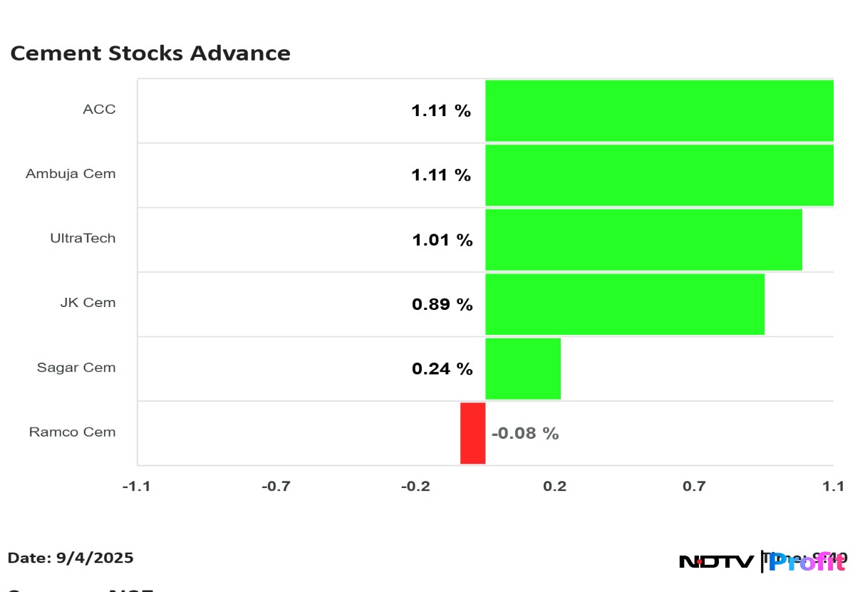 ACC Ltd., Ambuja Cement Ltd., and UltraTech Cement Ltd. share prices jumped in Thursday's session as the Goods and Services Tax on cement fell to 18% from 28%. The latest rate revision was part of the GST reforms which will come into effect from Sept 22.