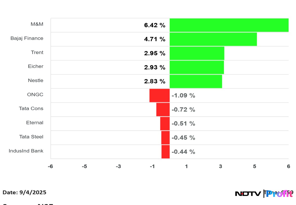 Mahindra & Mahindra Ltd., Bajaj Finance Ltd., Trent Ltd., Eicher Motors Ltd., and Nestle India Ltd. are top gainers in the NSE Nifty 50 index.