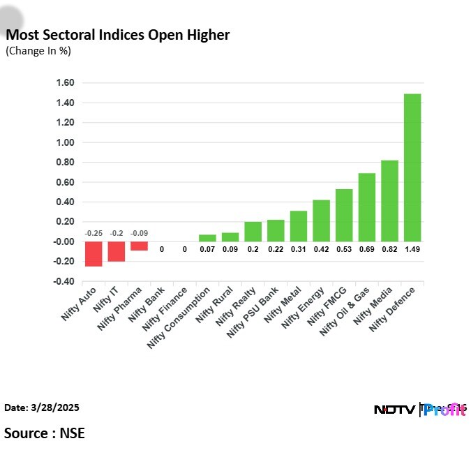 At market open on Friday most sectoral indices opened with gains. Nifty Defence and Nifty Media surged the most.