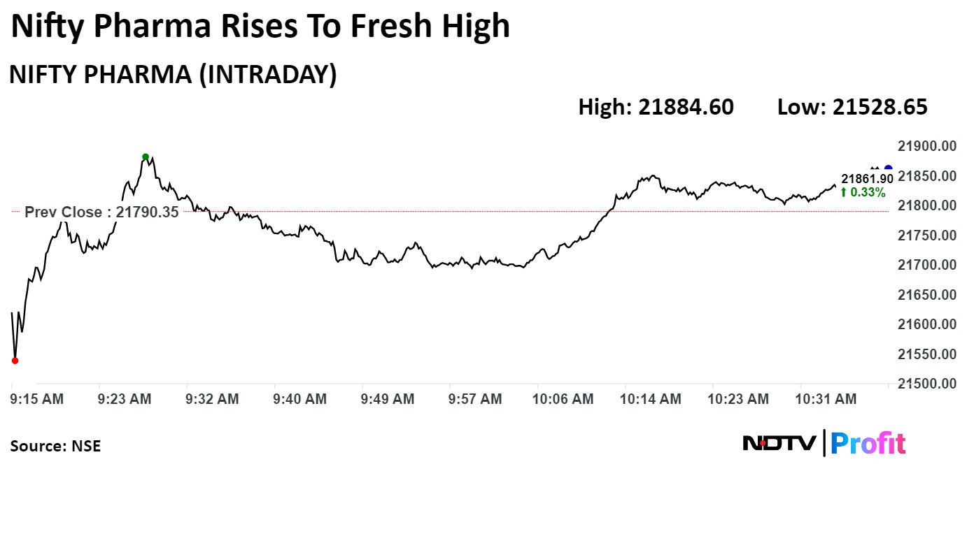 The NSE Nifty Pharma index hit a life time high of 22,005.10