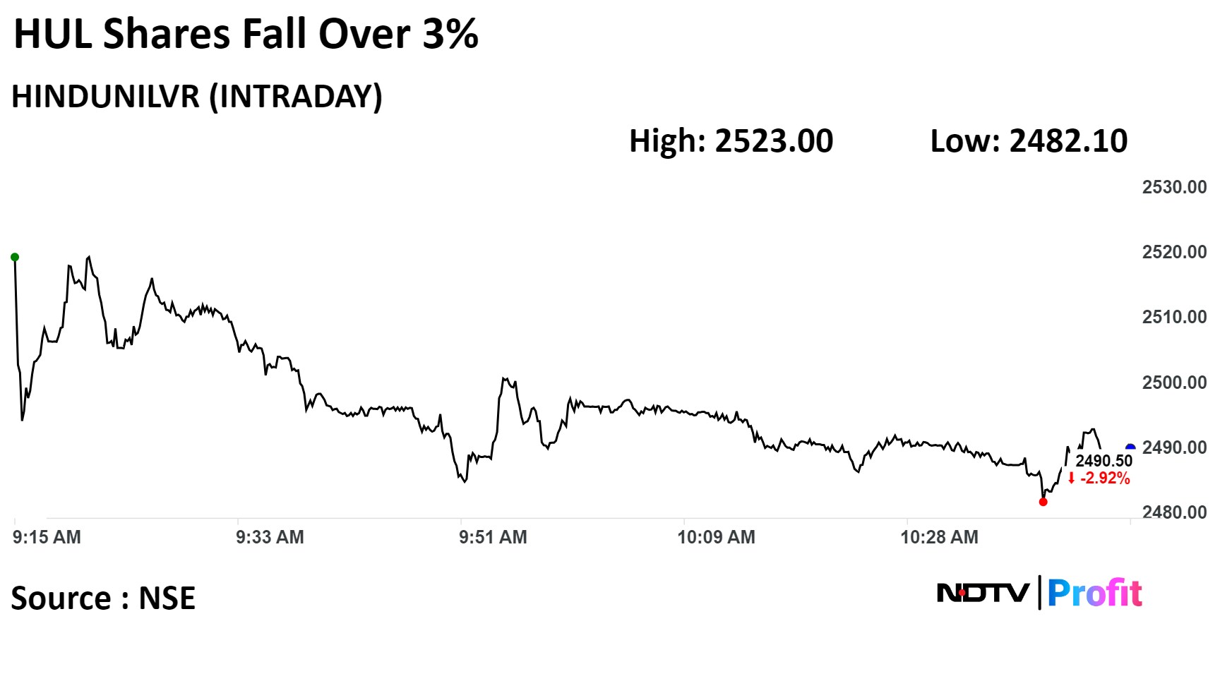 The scrip fell as much as 3.25% to Rs 2,482.10 apiece, the lowest level since Nov 17, 2023. It pared gains to trade 2.96% lower at Rs 2,489.80 apiece, as of 10:51 a.m. This compares to a 0.3% advance in the NSE Nifty 50 Index.