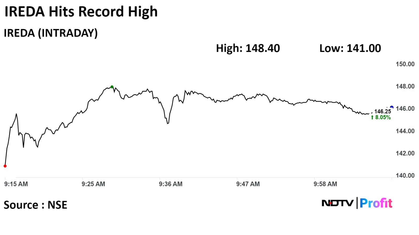 Indian Renewable Energy Development Agency Ltd. shares rose over over 9% to hit an all-time high. It rose as much as 9.64% at Rs 148.40.