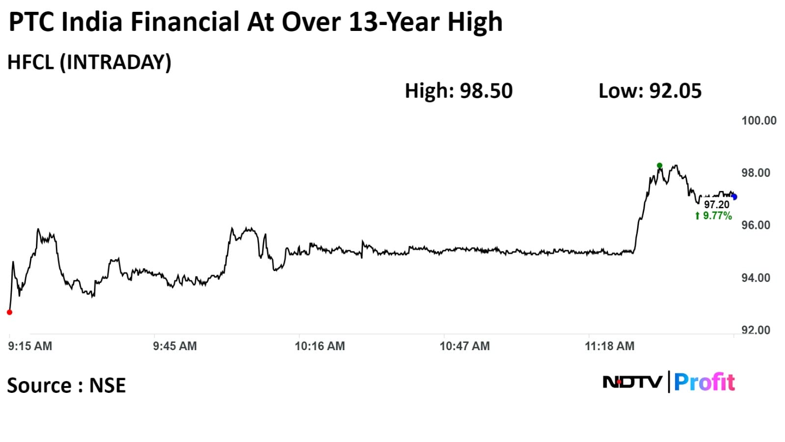HFCL Ltd rose as much as 8.5% to Rs 96.10 apiece, the highest level since Jan 17, 2022. It was trading 7.28% higher at Rs 95.00 apiece, as of 10:16 a.m. This compares to a 0.16% advance in the NSE Nifty 50 Index.