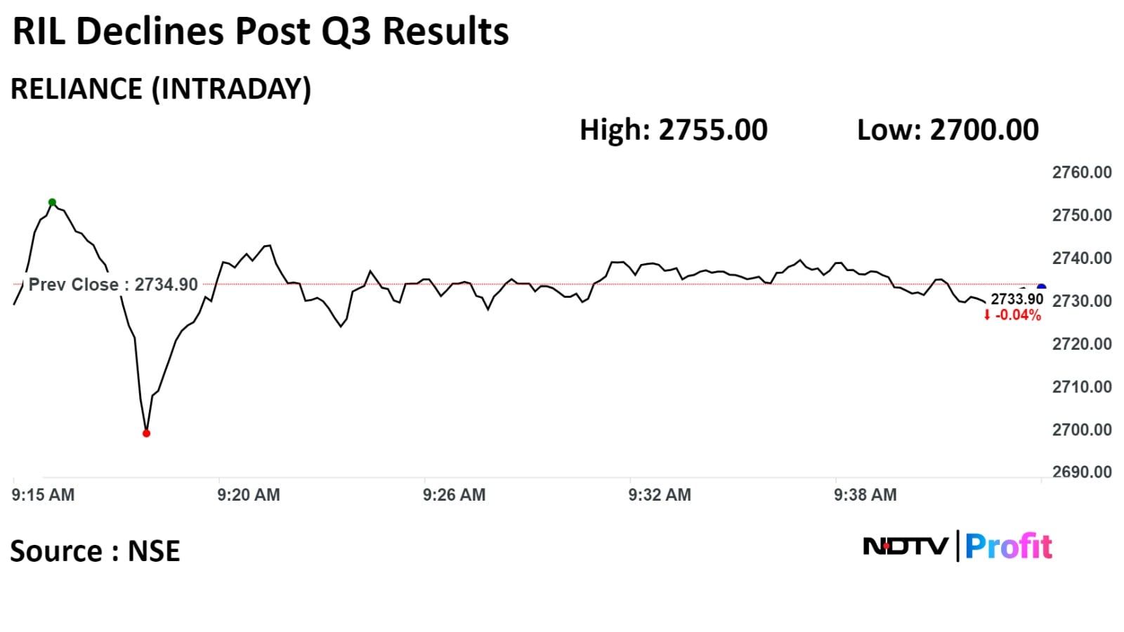 Shares of Reliance Industries Ltd declined in the Saturday session after the company's net profit for the Oct-Dec period declined 0.74%, missing analysts' expectation.