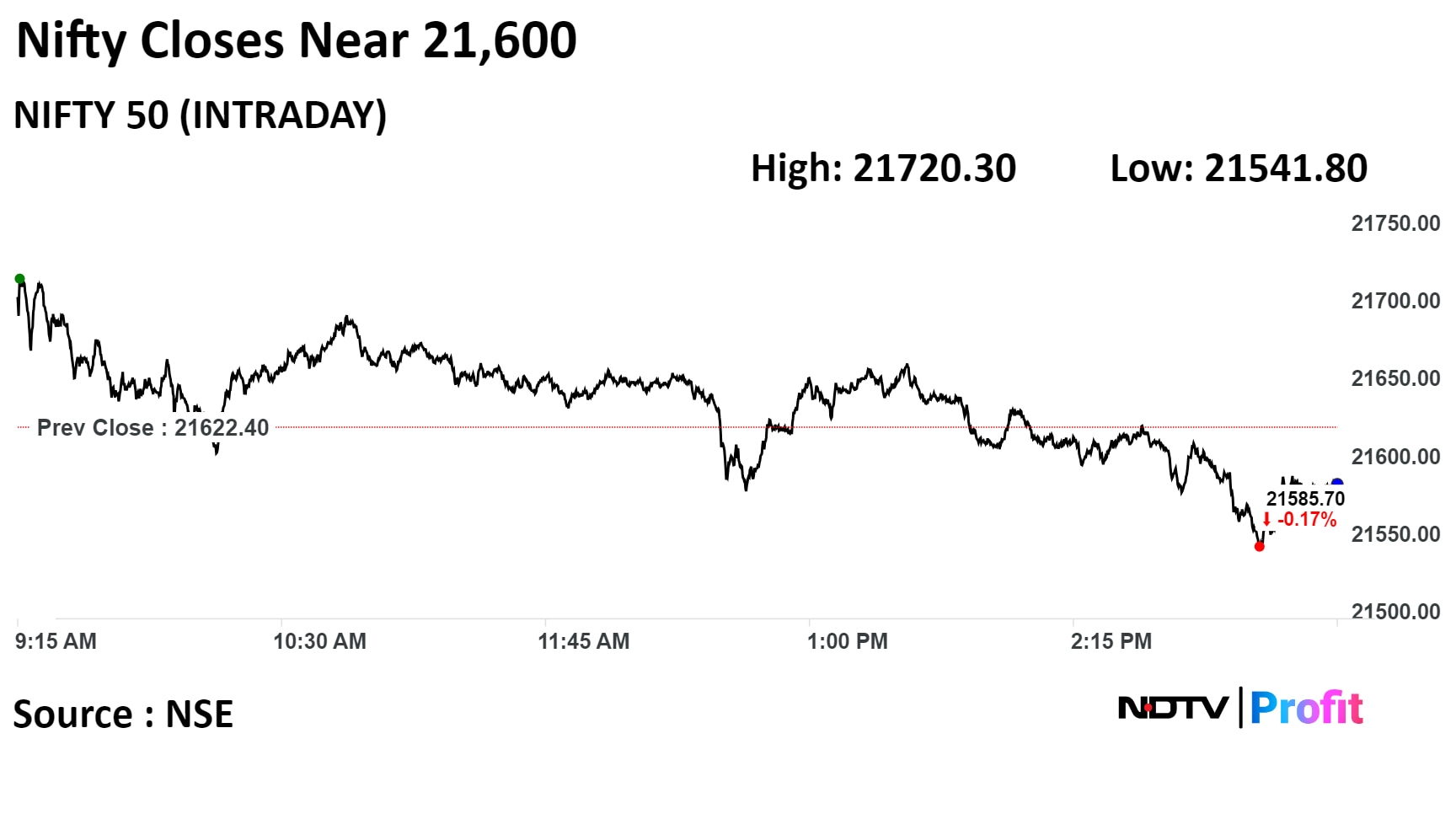 The Nifty index closed 50.60 points or 0.23% lower at 21571.80 while the Sensex lost 259.58 points or 0.36% to close at 71423.65.