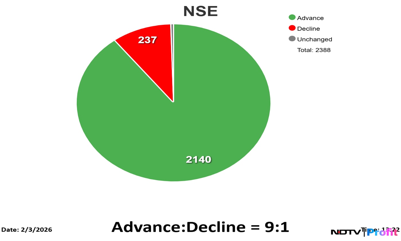 Nine out of every ten stock listed on the NSE is trading higher than its previous close, reflecting the broad based nature of Tuesday's market rally fueled by the India-US Trade deal.