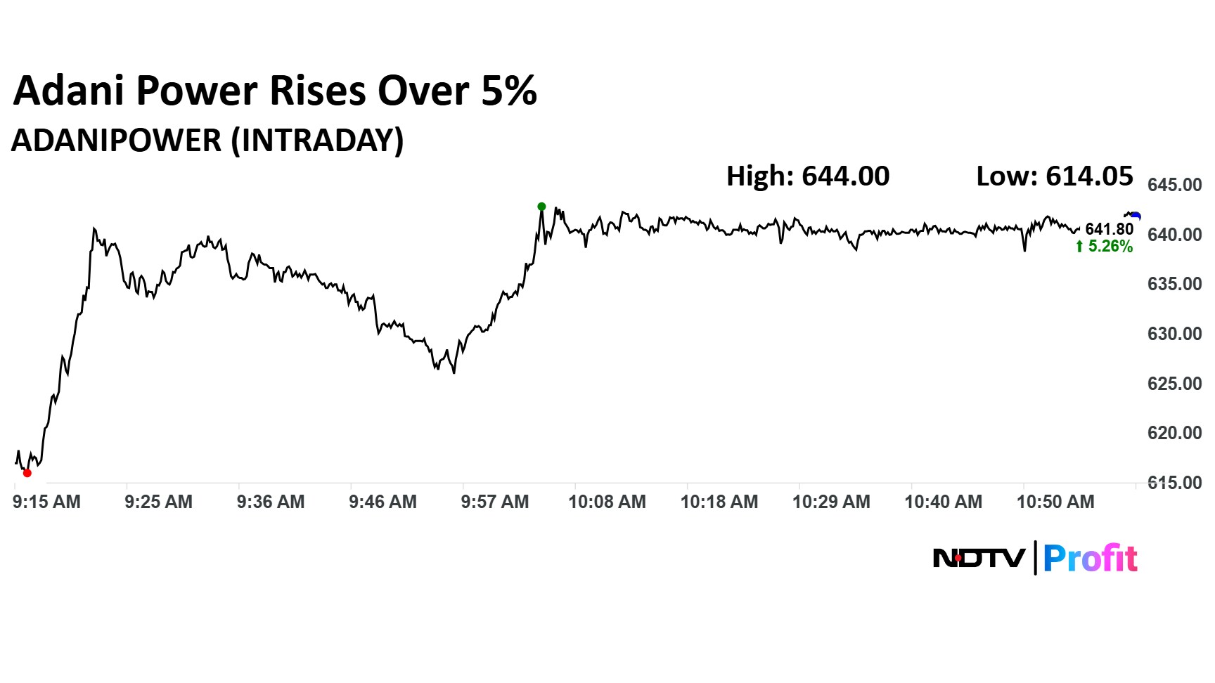 Adani Power Ltd. share price rose 5.63% to Rs 644 apiece. Adani Green Energy operationalised solar project of 87.5 megawatt capacity at Khavda.