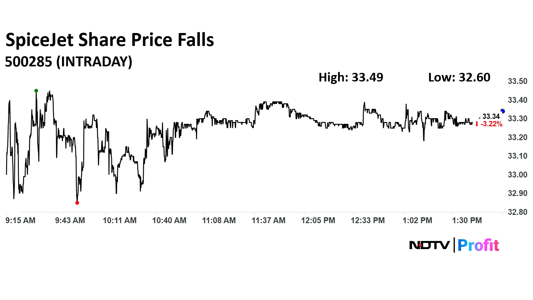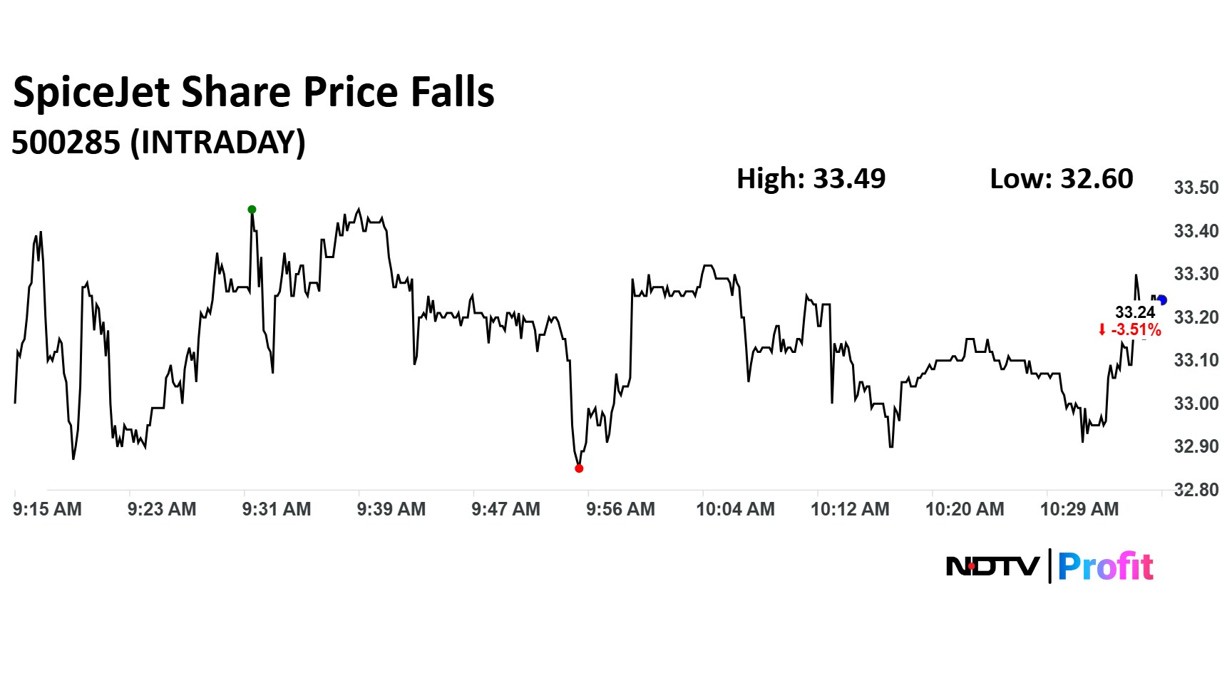 SpiceJet Ltd. share price fell 5.37% to Rs 32.60 apiece. It was trading 3.57% down at Rs 33.22 apiece as of 10:39 a.m.