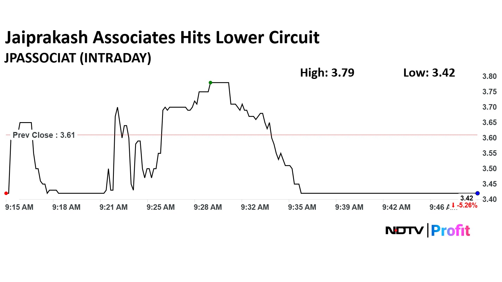 Jaiprakash Associates share price hit a lower circuit and fell to a low of Rs 3.42 apiece. As of 9:50, the stock remained locked in the lower circuit.