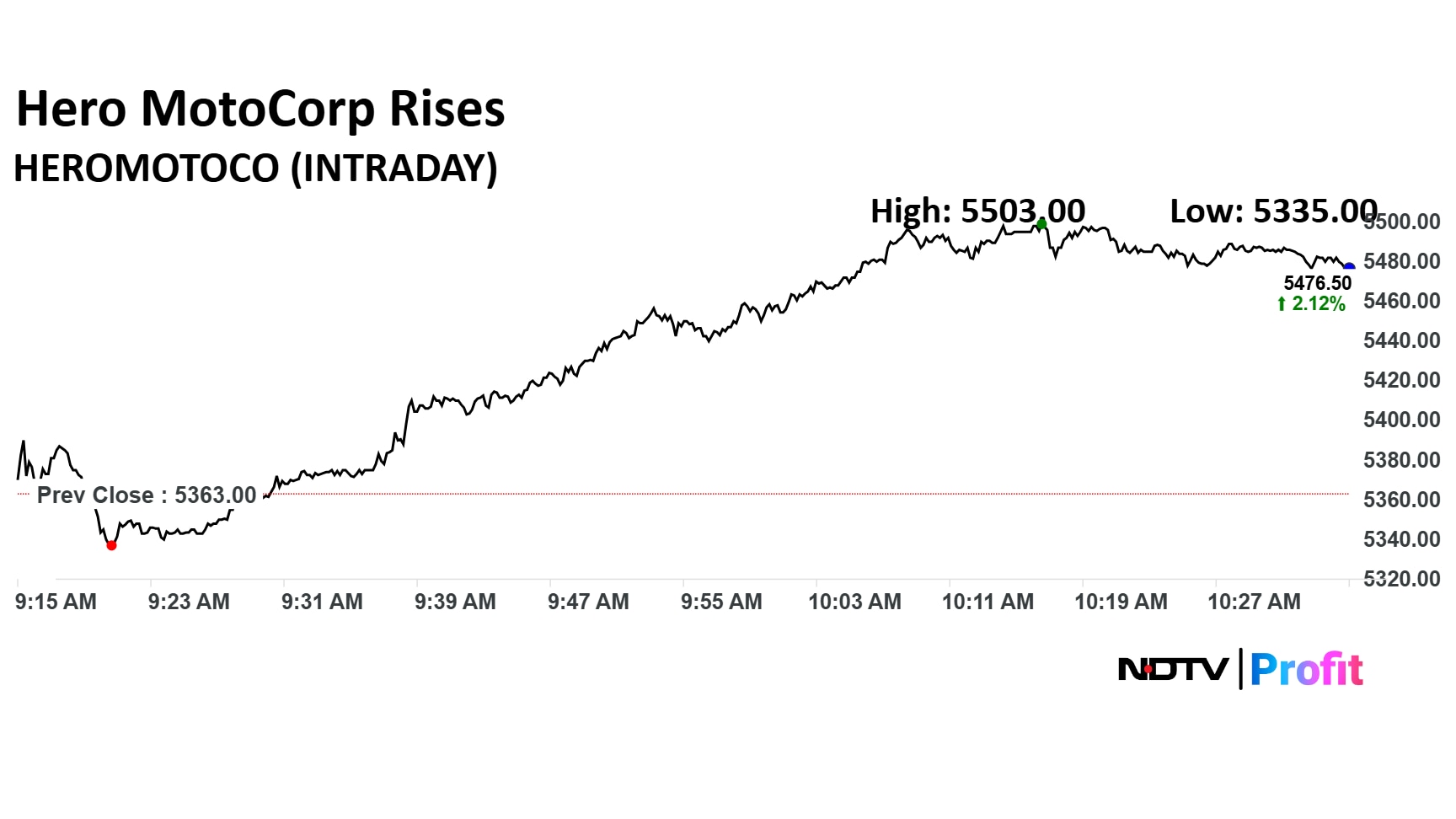 Hero MotoCorp share price rose for six days in a row. The stock price was trading 1.94% higher at Rs 5,466 apiece as of 10:36 a.m.