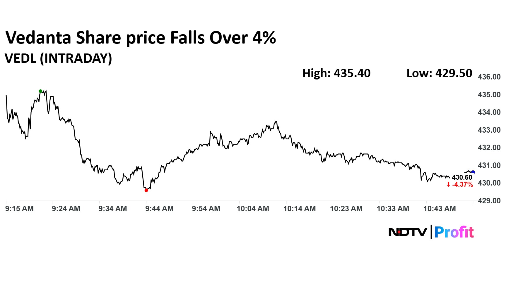 Vedanta share price fell as much as 4.62% to Rs 429.50 apiece. It was trading 4.41% down at Rs 430.45 apiece as of 10:55 a.m.