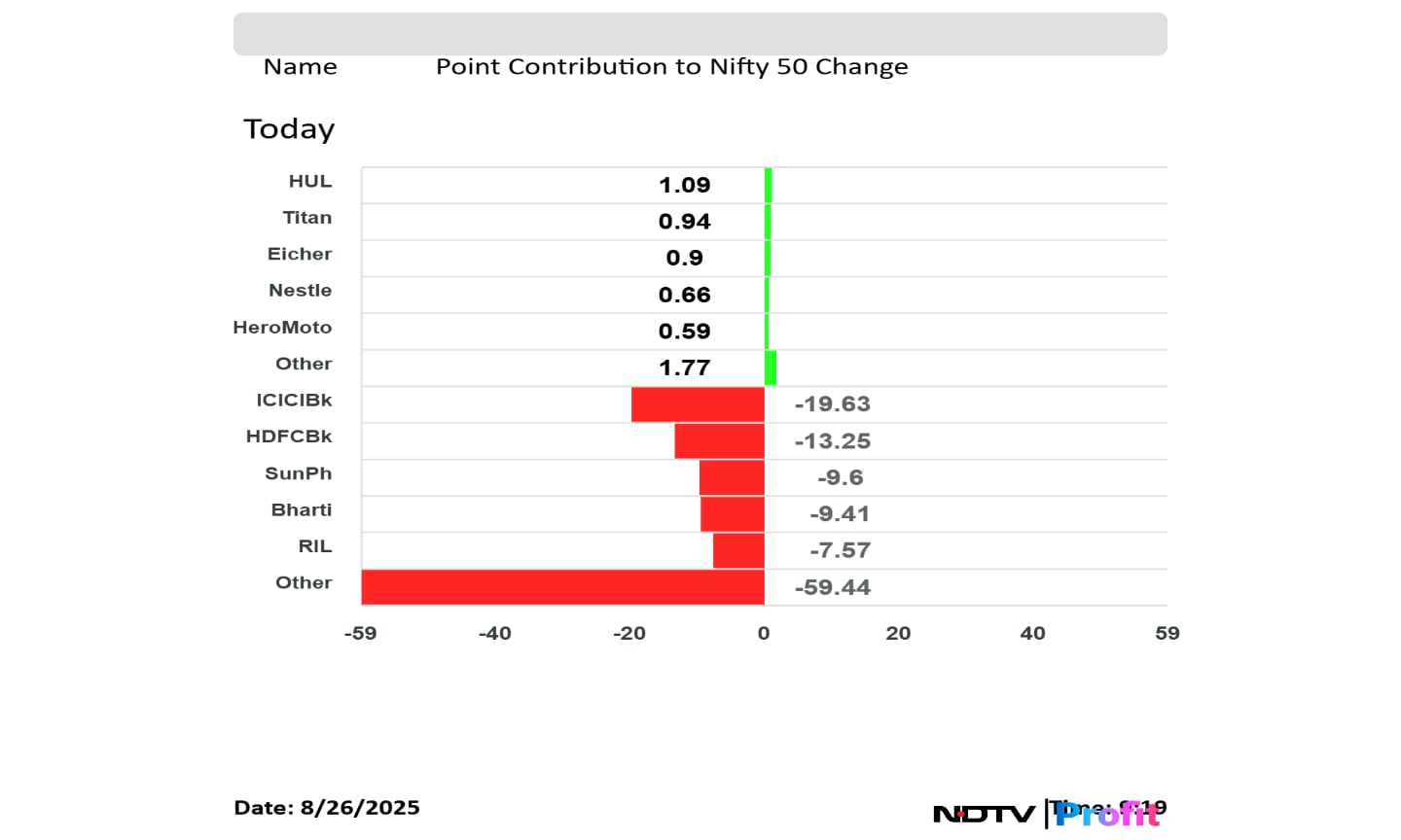 Hindustan Unilever Ltd., Titan Co. Ltd., Eicher Motors Ltd., Nestle India Ltd., and Hero MotoCorp Ltd. limited losses in the NSE Nifty 50 index.