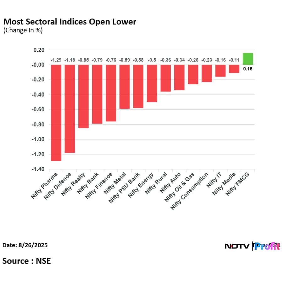 On National Stock Exchange, 14 sectoral indices opened lower with the NSE Nifty Pharma declining the most. The NSE Nifty FMCG rose the most.