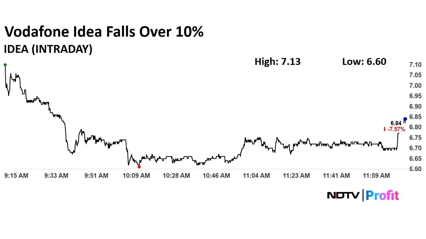 Vodafone Idea share price slumped 10.81% to Rs 6.60 apiece. The stock was trading 7.84% down at Rs 6.81 apiece as of 12:19 p.m.