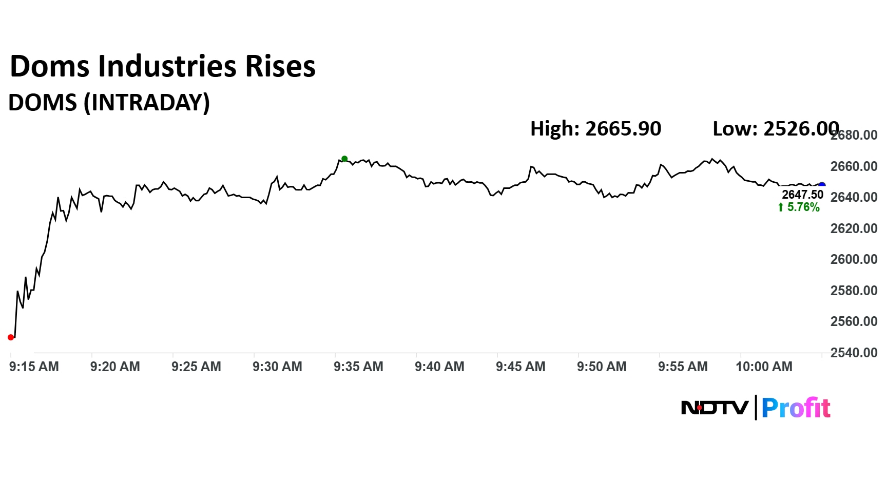 Doms Industries Ltd. share price 6.49% to Rs 2,665.90 apiece, the highest level since Sept 5. It was trading 5.42% higher at Rs 2,640.10 apiece as of 10:07 a.m.