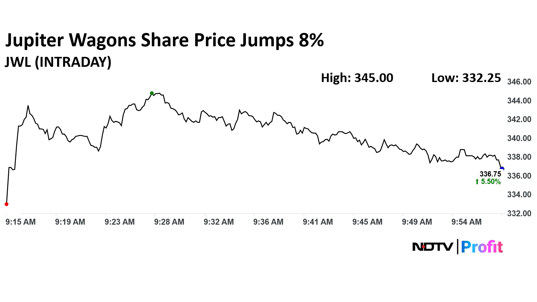 Jupiter Wagons Ltd. share price jumped 8.08% to Rs 345 apiece, the highest level since Aug 22. The company’s arm Jupiter Tatravagonka Railwheel Factory has received a Letter of Acceptance from the Ministry of Railways, Railway Board, for an order worth approximately Rs 113 crore to supply 9,000 LHB axles.
