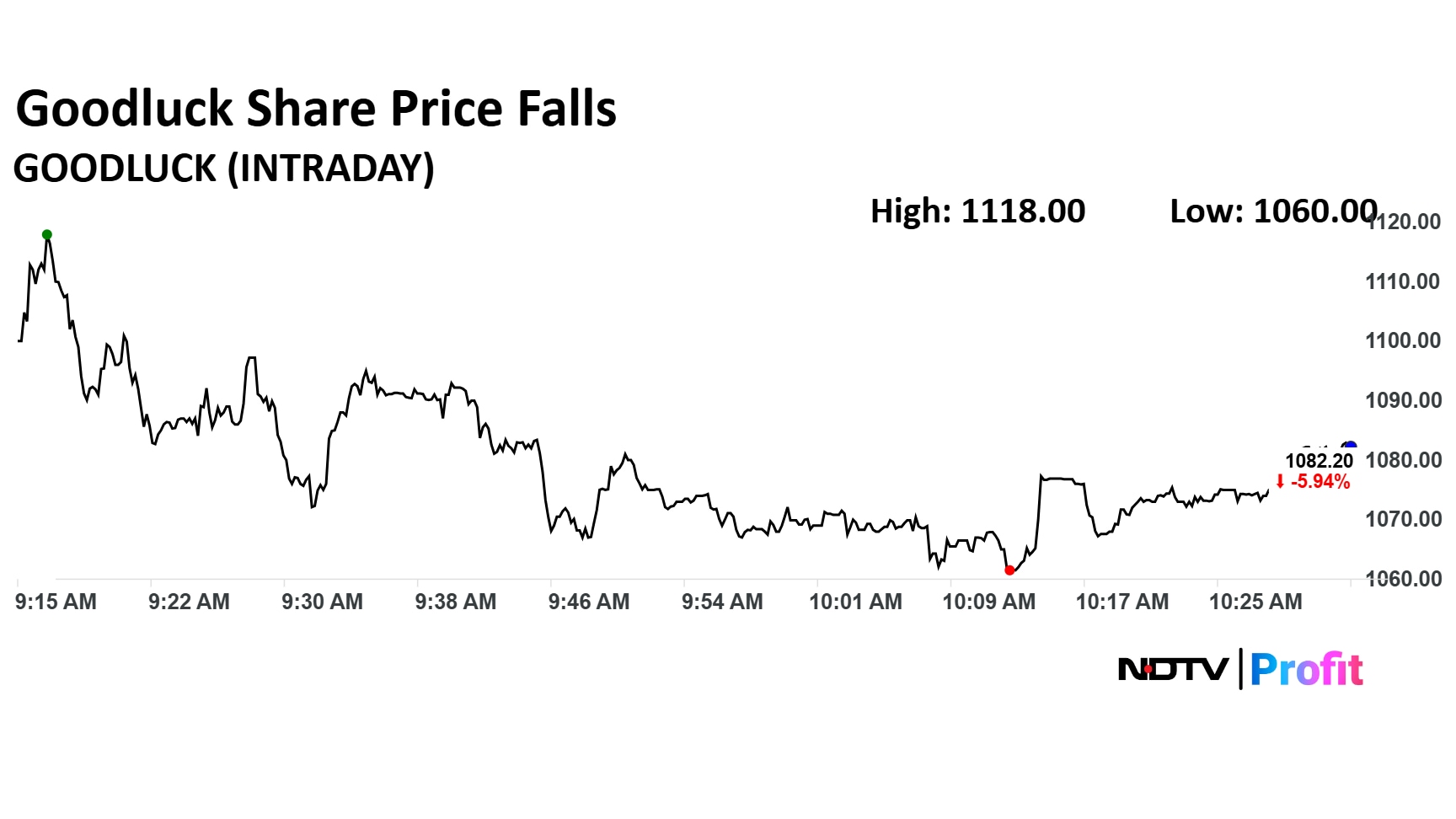 Goodluck India share price slumped 14% in last two session. The stock was trading 6.05% down at Rs 1,080 apiece as of 10:34 a.m.